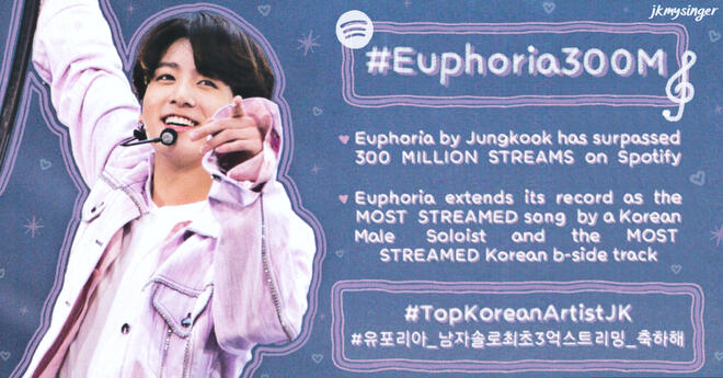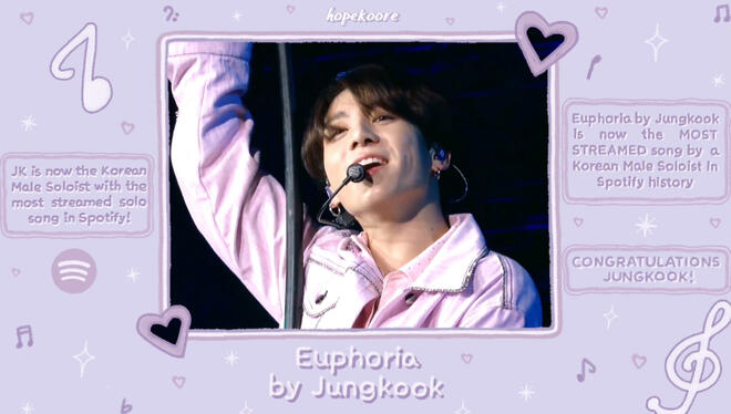 Euphoria by Jungkook, the MOST STREAMED song by a Korean Male Soloist on Spotify, is so close to becoming the MOST STREAMED solo song by a Korean Act. Please keep streaming every day!